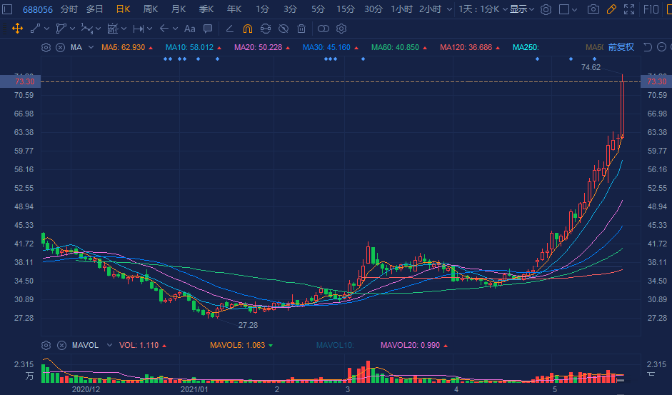 莱伯泰科(688056.H)拉升逼近涨停,盘中高见74.62元再度刷新历史新高价,总市值达50亿元。 该股近一个月持续拉升涨上扬,股价已翻倍。莱伯泰科日前发布首款质谱仪,进军医疗、医药、半导体等行业。公司将依托现有的技术及产品,推动实验分析仪器从自动化、高通量、多功能向全流程自动化和智能化发展,力