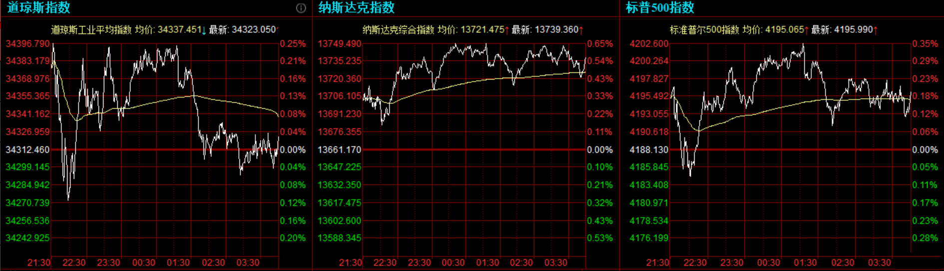 美股三大指数集体收涨,经济重启概念股推动大盘上扬。美国疫情形势趋缓、近半国民已接种疫苗,使投资者对经济复苏前景持乐观预期。 道指收涨10.59点,或0.03%,报34323.05点;纳指涨80.82点,或0.59%,报13738.00点;标普500指数涨7.86点,或0.19%,报4195.99点。 大型科技股涨跌不一,苹果跌0.04%,亚马