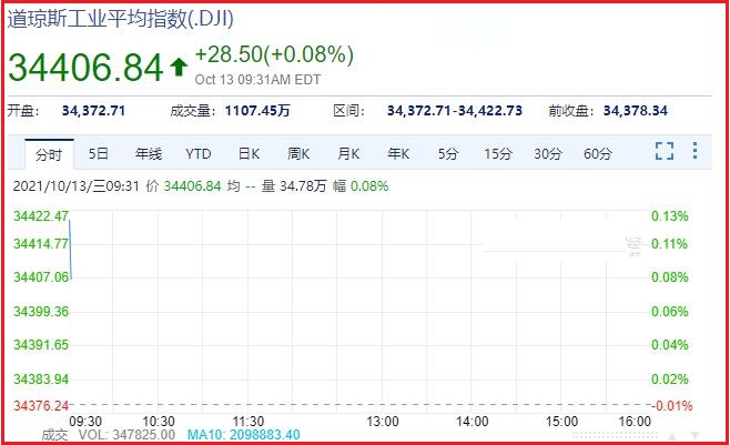 美股三大指数集体高开,道指涨0.05%,纳指涨0.48%,标普500指数涨0.21%。美股第三季度财报季拉开帷幕,贝莱德涨超3%,公司Q3盈利超出预期;达美航空跌超2%,公司警告第四季度可能出现税前亏损。雾芯科技涨超10%,此前FDA首次批准雾化烟TA在美国市场合法销售。 1、截止发稿时间,道琼斯报于:34421.85