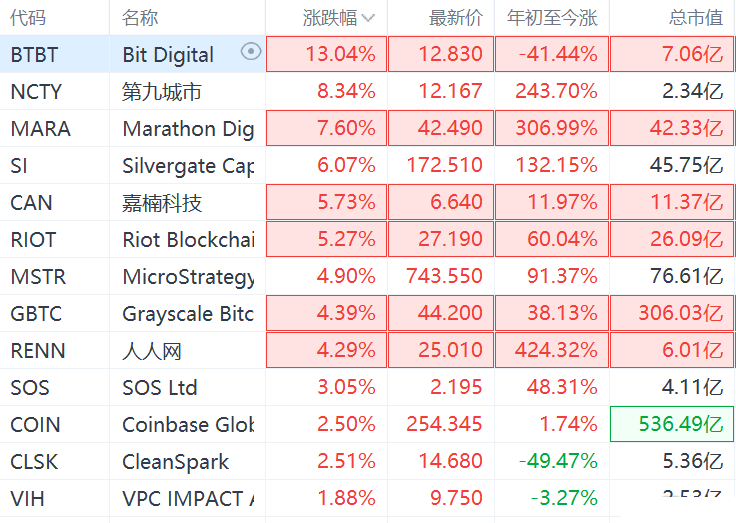 加密货币走强,带动美股区块链概念股集体上涨。其中,itDigital大涨13%,第九城市涨超8%,arathoDigital涨超7%,嘉楠科技、Riotlockchai涨超5%,Coia涨超2%。比特币今日一度站上57000美元/枚,为5月12日以来首次。