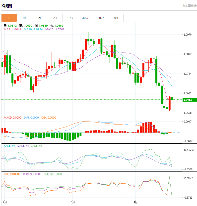 欧元跌后回升 欧元早些时候一度下跌多达0.30%,但随后回升并走高。北美时段,欧元/美元报1.0666,上涨0.21%。欧元仍然受到美元走强的压力。上周,欧元/美元下跌1.8%,本周最低跌至1.0601,为11月初以来的最低水平。 今天没有美国数据公布,欧元区也只有一项数据。德国3月份I同比下降2.9%,连续第九个月