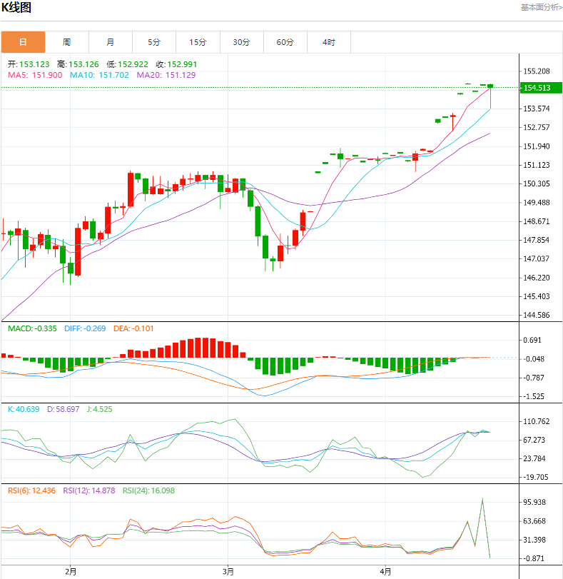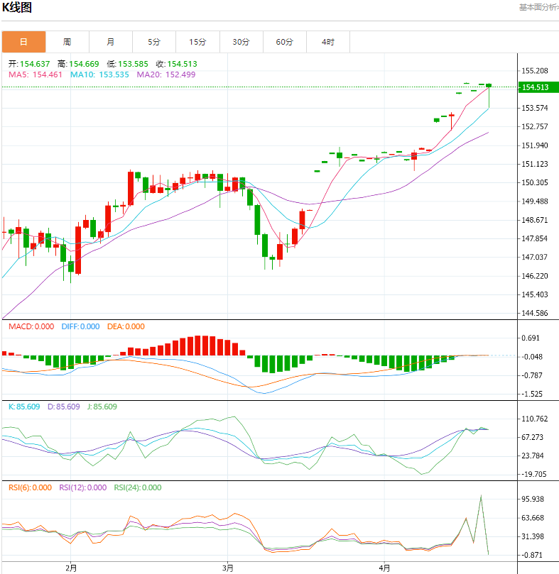 周五美市盘中,美元兑日元上升至-0.124,增幅-0.08%。日本将会进行干预以阻止日元兑美元进一步贬值至155。 货币对:美元/日元 行情分析:汇价高见154.669,低见153.585。上一交易日,汇价收于154.706。基本面上看,日本央行董事会成员指出,日本央行维持超宽松货币政策、寻求劳动力供需平衡至关重要。日
