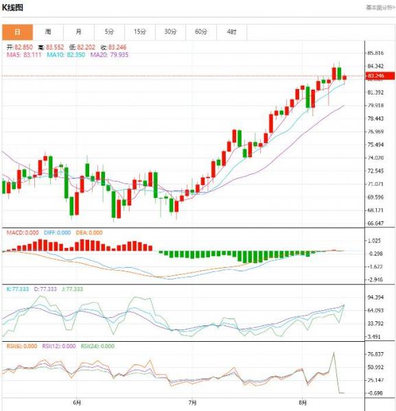 星期四(八月十日)亚洲时段,美原油小幅上涨,达到每桶84.68美元的近十个月高点。在此之前,美国成品油库存大幅下降,沙特阿拉伯和俄罗斯的减产盖过了对亚洲主要国家需求放缓的担忧。此外,市场预计美联储加息周期即将结束,为油价提供支撑。 原油盘面分析: 受市场供应短缺和乐观