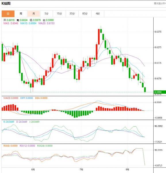 新西兰元已连续第四天下跌。欧洲时段,纽元/美元报0.6005,下跌0.26%。新西兰新西兰货币的走势非常糟糕,本周下跌了1.50%。新西兰元/美元自7月初以来就没有出现过一周的上涨,并且自那以来已经暴跌了270个基点。新西兰元的最新挫折是新西兰最大贸易伙伴中国的疲软数据。 中国大肆吹捧的复苏已经失败。政