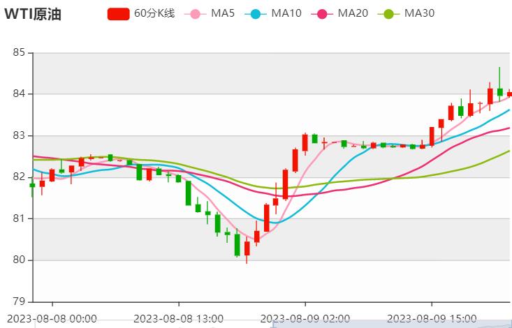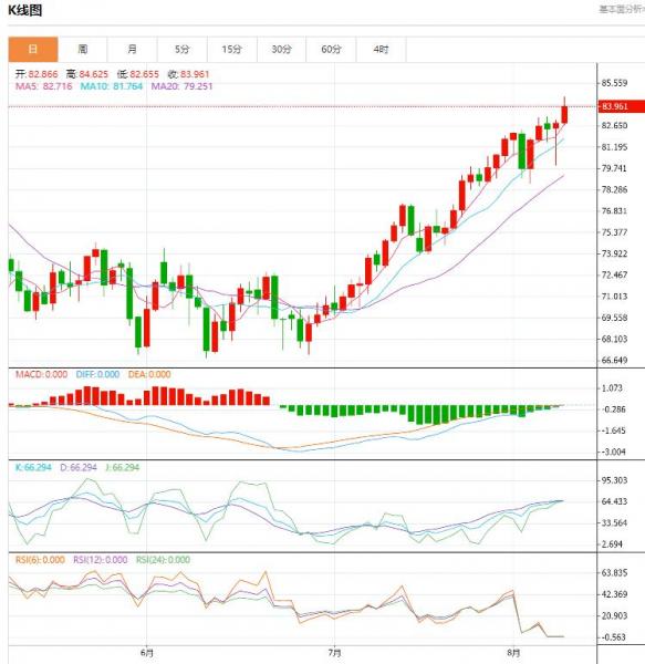 美国劳工部看懂统计局将公布7月未季调CI年率,前值为3%,预期值3.3%,预期将小幅度上升,因为7月份国际油价大涨15.74%,最高达到82美元每桶,能源价格将显著影响CI,所以上述市场预期符合逻辑。 今日原油价格技术分析: 昨天,美原油价格小幅上涨。从技术面来看,原油站在84线上突破了之前的双