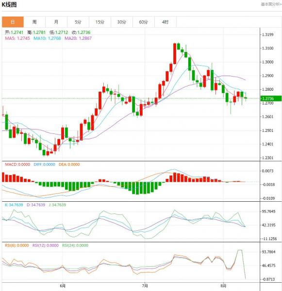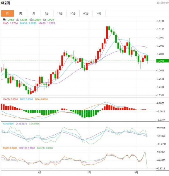 周三盘中,英镑/美元货币兑1.2735/1.2734,下跌了-0.0013,跌幅-0.09%。英镑兑美元周二尾盘的反弹使8月3日的锤形反转受到提振,长下影线暗示供应减弱,盘面倾向看涨,可以在1.2690逢低买入,阻力区域从1.2885到1.2805,1.31445-1.2620的38.2%费波纳奇回档位在1.2820。日线图负动能有望在未来几个交易日转为正动能,今