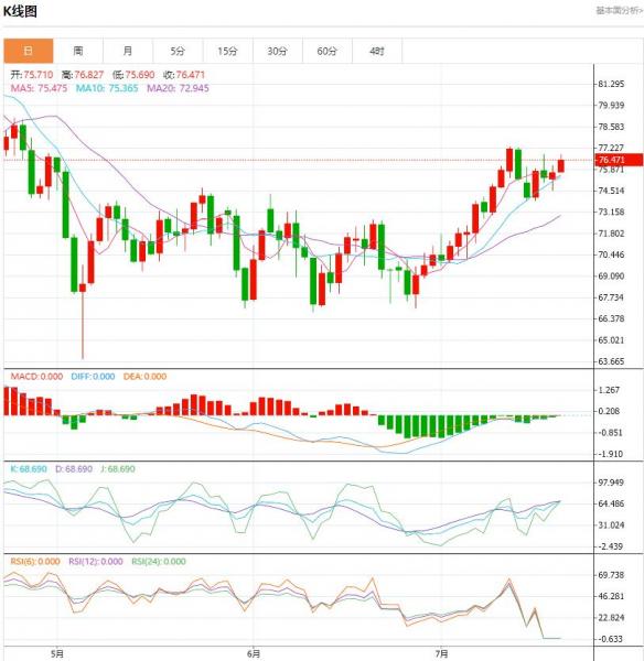 由于美元和美国国债收益率上升,美国原油库存减少,中国原油进口增加,推动原油上涨,不过疲软需求前景令投资者保持谨慎。 今日原油价格技术分析: 原油早间开盘价直接位于76美元一线,并有继续上涨的趋势,时刻都有突破前几天新高的可能。ACD金叉运行良好,KDJ死叉信号减弱,10日均线为