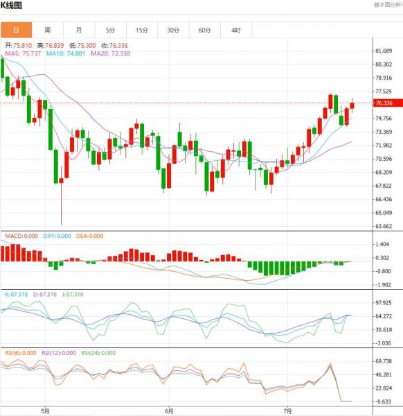 全球石油市场正显示出供需平衡趋紧的基金前景。 今日原油价格技术分析: 油价一再受到200日均线的压制。上星期,油价在这个阻力附近录得“吞没”看空K线组合,昨天(7月19日),录得长上影线阴线,表明这个位置的阻力非常强,油价短期见顶的风险增加了。下方,关注100日均线73.48附近的支撑