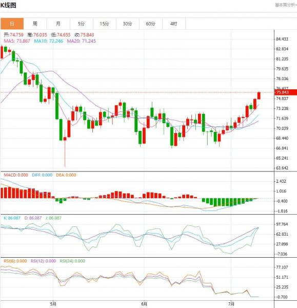星期三(七月十二日)亚欧时段,美原油窄幅震荡。尽管AI原油库存意外大幅增加,但根据AI最新数据表明,截至7月7日的一周,美国原油库存增加302.6万桶,远远超过预计的20万桶增长。不过,多头仍有担忧,但技术看涨信号继续增强。 原油盘面分析: WTI原油价格周二上涨2.2%,延续上周末以来