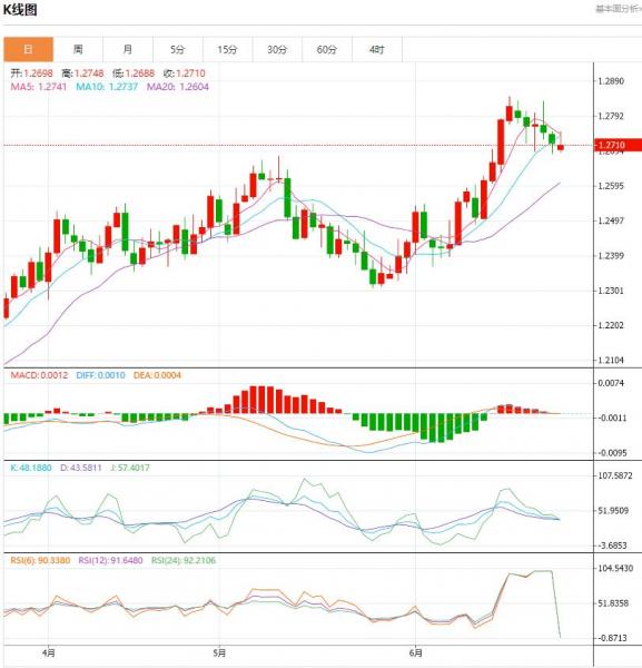 周一盘中,英镑/美元货币兑1.2711/1.2710,下跌了-0.0009,跌幅-0.06%。英镑/美元保持在1.27上方,俄罗斯兵变事件已消化。周一到目前为止,英镑交投区间为33个点:1.2705-1.2738。1.2685-1.2737是上周五伦敦盘交易区间(在周四英国央行决议之后表现活跃),1.2845是英国央行加息至5%后的膝跳反应高点(1.2685=随后出现的