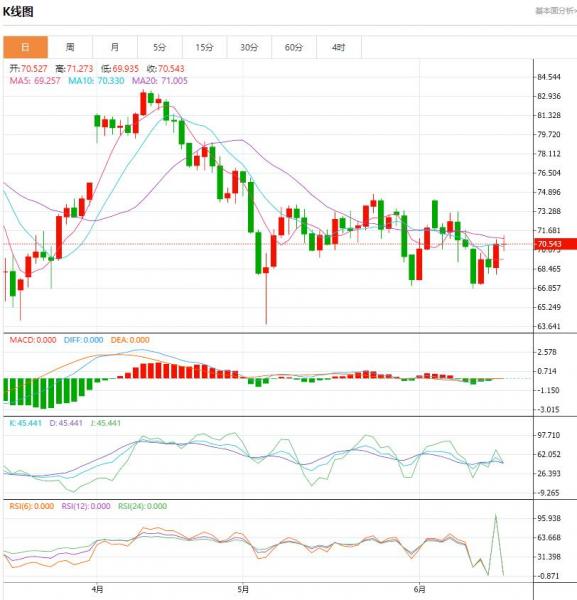 周五(6月16日)原油开盘报70.79美元,维持隔夜的上攻势头。昨天油价上涨约3%,达到一个星期以来高点,因美元走软,以及最大原油进口国中国的炼油厂加工量跃升。 原油盘面分析: 周四油价上涨的背景是来自中国的消息,中国5月份炼油厂产量增长了15.4%,证实了强劲的石油需求,以及美国的零