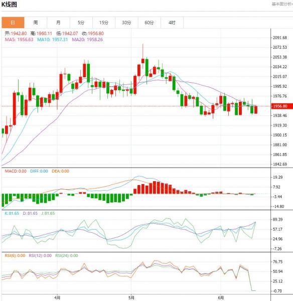 周五(6月9日),国际金价基本持稳。隔夜金价大涨逾1%,使得周线有望收涨,因美联储暂停加息预期导致美元指数暴跌。但考虑到短期势头耗尽,以及三重看跌势头背离仍然有效,金价短期内最有可能的走势仍是进一步区间波动。 北京时间15:17,现货黄金下跌0.06%至1964.24美元/盎司;COX期金主力合约上浮0.03%