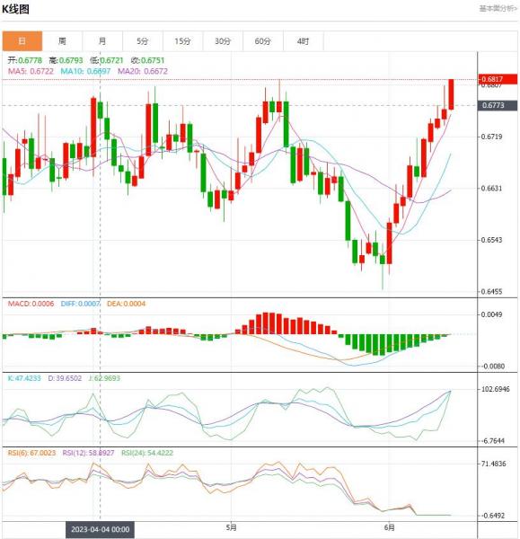 澳元继续上涨,交易价格为0.6795,上涨0.42%。澳元在6月一直炙手可热,上涨4.4%。 澳大利亚周四早些时候发布了5月份的就业报告。尽管央行大幅加息,但劳动力市场仍保持稳健,但可能出现裂痕。4月,澳大利亚三个月来首次裁员,其中包括27100个全职工作岗位。除非确信劳动力市场正在降温,否则澳洲联储将