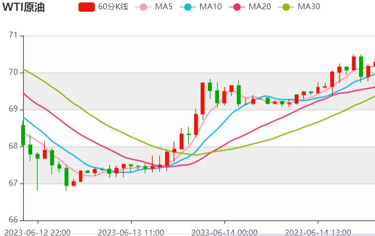 星期三(六月十三日)亚欧时段,美国原油延续隔夜反弹趋势,强化了市场对美联储本周暂停加息的预期。美股延续涨势,创一年多来新高,为油价提供支撑。 原油盘面分析: 原油终于在昨日强劲反弹中找到支撑,当天WTI收盘涨幅在2.9%左右,略低于每桶70.00美元的心理关口。由于市场参与者在FOC