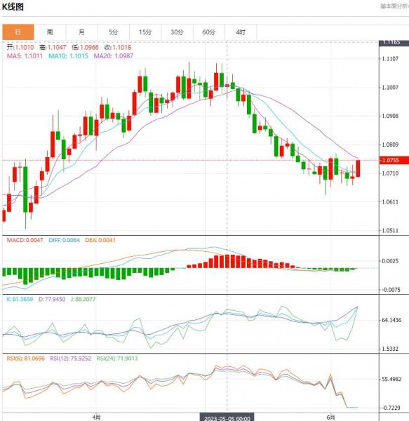 周四盘中,欧元/美元货币对1.0756/1.0756,上升至0.0057,增幅0.54%。欧元/美元仍获良好买气,但FD会议前市场谨慎行事。 在下周的FOC会议之前,市场似乎不愿意将欧元/美元推得太远。周三K线图十字星暗示了犹豫不决,但周四早些时候的买气仍在,10日移动均线定义了5月的熊市趋势:该均线仍在上方设限。