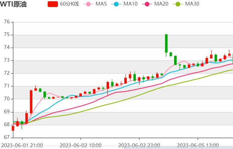 上星期五(6月2日)油价大涨。今日(6月5日)开盘,油价高开近2%,得益于欧佩克+周末将减产协议延长至2024年,沙特阿拉伯已承诺在7月大幅减产。此外,拜登签署债务上限法案使美国避免了债务违约,这也提振了油价。 原油盘面分析: 在欧佩克+宣布从7月1日起削减周末产量目标后,原油周一开