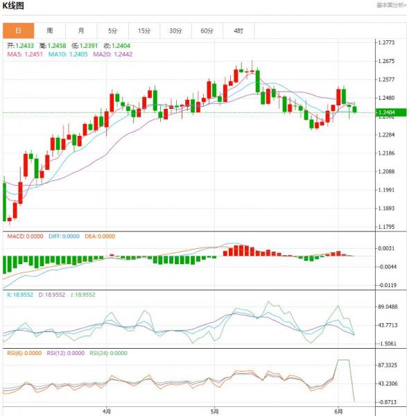 周二盘中,英镑/美元货币兑1.2406/1.2405,下跌了-0.0030,跌幅-0.24%。周一(6月5日)英镑兑美元当日一度低落至1.2368,但微盘阶段快速回升,最后收盘于1.2441水平附近。周一公布的活动数据显示,英国服务业公司回复称,5月投入成本压力创三个月来新高,在稳健增长的背景下,其收费价格急剧上升,令英国央行面临继续