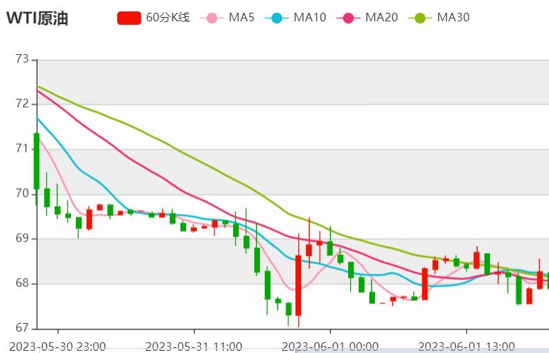 周四(6月1日)亚欧时段,美原油小幅反弹,目前交投于68.81美元/桶附近,美国债务议案在众议院通过投票,美联储6月份加息预期降温,提振原油需求前景,而且过去两个交易日油价跌幅较大,短线也存在调整需求;今明两天有较多经济数据,周末还将迎来OC+会议,部分空头提前获利了结离常 原油盘面分析: