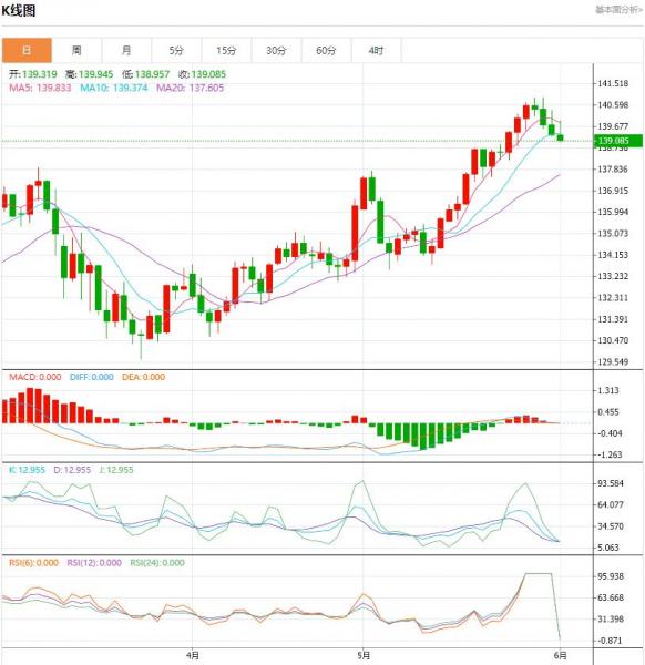 周四盘中,截止目前,美元/日元货币对139.095/139.084,下跌至-0.238,跌幅-0.19%,美元/日元正酝酿恢复多头走势。 周三回撤至10日均线,依据电子交易系统()报价,一目均衡转换线触及我们的买进价格139.25。日线一目均衡转换线位于139.18,这也是5月从133.50涨至140.93的23.6%费波纳奇回档位。目标是