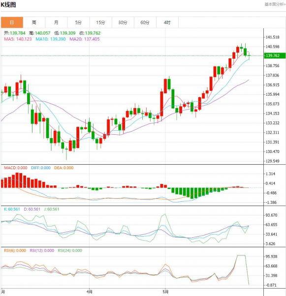 周三盘中,截止目前,美元/日元货币对139.767/139.756,下跌至0.007,跌幅0.01%,美元/日元多空讯号并陈。 从140.93的趋势高点拉回,刚刚跌破电子交易系统()上的10日均线切入位139.35。如果收盘价低于自5月15日以来给予支撑的均线,将具有破坏性。我们在139.25买进,预期将恢复多头走势。鉴于有可能