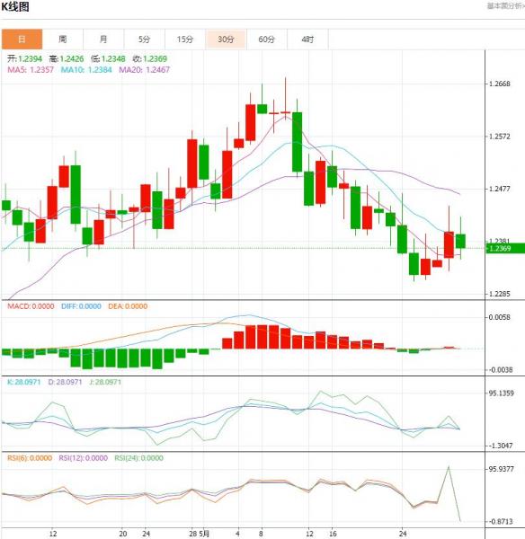 周三盘中,截止目前,英镑兑美元下跌至1.2368/1.2367,跌幅-0.27%。英镑/美元周二反弹未能突破云区,但有效破坏空头走势。 英镑/美元回升走势在逼近38.2%费波纳奇回档位1.2450时失败了,这是1.2679-1.2308跌势的38.2%回档位,无法扩大突破云区,英镑回到了1.2175-1.2408云区之内。周二的反弹确实破坏了