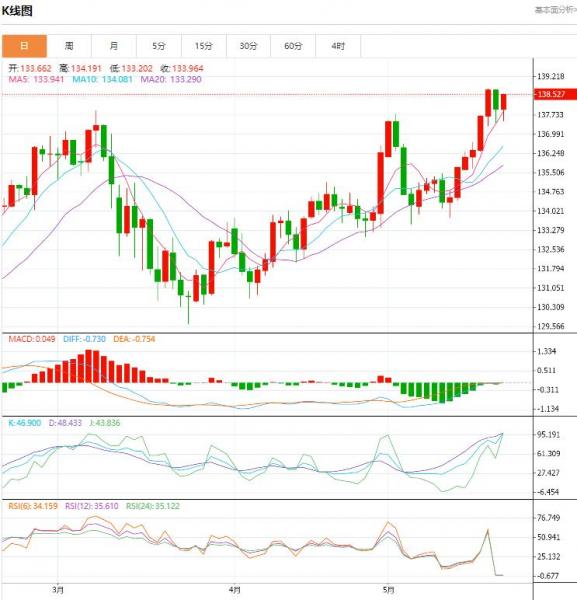周二盘中,截止目前,美元/日元货币对138.864/138.854,上升至0.269,增幅0.19%,美元兑日元小幅冲高,刷新近半年高点至138.84,涨幅约0.18%,因市场对美联储加息预期升温,且对美国债务违约的担忧情绪降温。 货币对:美元/日元 行情分析:汇价高见138.906,低见138.236。上一交易日,汇价收于138