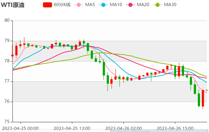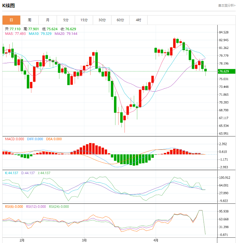 今日晚间周三,原油报76.841/76.881。黄金报1994.44/1994.79。星期三(四月二十六日)亚洲时段,美原油微微上涨,AI原油库存大幅下降,跌幅远超市场预期,帮助油价从100天左右的移动平均线反弹。此外,此前对美联储年内降息的预期降温,美元指数收复隔夜涨幅,为油价提供支撑。 原油盘面分析: