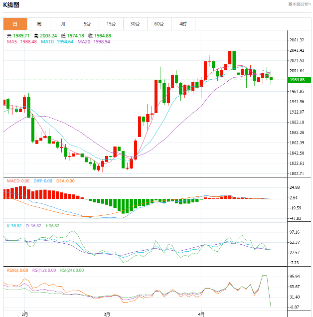 周四(4月27日)欧市早盘,现货黄金维持日内升势,金价现报1998美元/盎司附近。本交易日,黄金交易员关注美国GD数据,预计将引发黄金市场大行情。尽管金价再次上升,但金价继续保持在本周的交易区间内,在2000美元/盎司附近徘徊,等待美国第一季国内生产总值(GD)初步数据的发布。 今日黄金价格技术分析