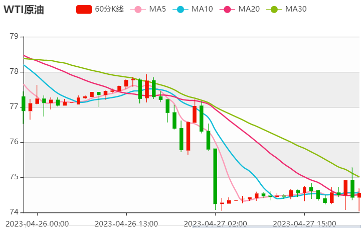 今日晚间周四,原油报74.431/74.471。黄金报1985.21/1985.52。星期三(4月26日)油价下跌近4%,延续了前一交易日的走势。根据数据显示,美国至4月21日当周IA原油库存-505.4万桶,预期-148.6万桶,前值-458.1万桶。 原油盘面分析: 原油隔夜下滑,填补了本月初OC+宣布减产时产生的价格缺口。