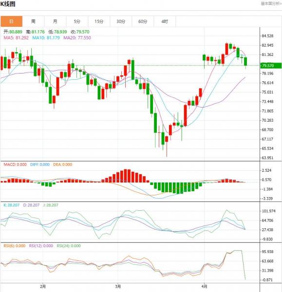 周三(4月19日),国际油价跌创逾两周新低,市场担心美联储继续加息可能会减缓经济增长并抑制石油消费,抵消了美国库存下降和中国经济数据强劲的积极影响。成品油利润率下降也暗示全球需求疲软。 北京时间16:55,YX原油期货下跌1.87%至79.35美元/桶;IC布伦特原油期货下跌1.79%至83.25美元/桶。两市分