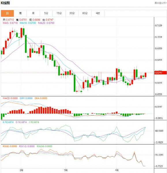 周三盘中,截止目前,澳元/美元货币对0.6721/0.6720,下跌至0.0002,跌幅0.02%。澳元/美元受鹰派的澳洲联储会议纪要和中国GD数据提振。 澳元/美元从0.6681(周一低点)持续上涨,触及0.6737,0.6737是上周五以来的最高水平(0.6808是上周五所及七周高点)。鹰派的澳洲联储会议纪要和中国第一季度GD数据好