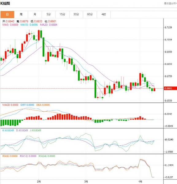 周三盘中,截止目前,澳元/美元货币对0.6690/0.6688,上升至0.0036,增幅0.55%。澳元兑美元稳步走高,因亚股上涨且美债收益率回落。澳元兑美元开盘报0.6642,亚洲上午时段澳元一路走高,目前上涨0.44%,交投于0.6668附近,收复了周一的大部分跌幅,美元震荡走弱,目前下跌0.23%。亚股上涨,给澳元兑美元带来更多支持