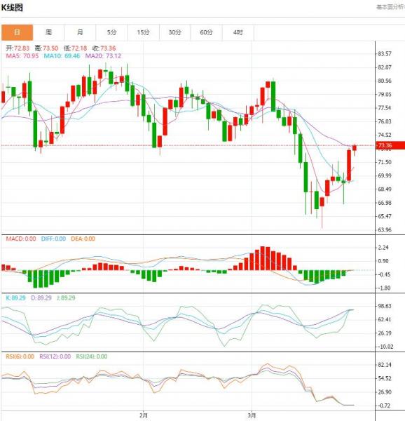 今日晚间周二,原油报73.27/73.31。黄金报1962.75/1963.05。星期二(三月二十八日),亚欧时段,美国原油窄幅波动,支撑了大部分隔夜涨幅。由于伊拉克停止从其半自治的库尔德斯坦地区出口一些原油,这意味着石油市场的石油供应减少,隔夜油价飙升超过5%,创下近两周新高。 原油盘面分析