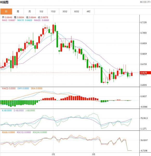 周二盘中,截止目前,澳元/美元货币对0.6680/0.6679,上升至0.0029,跌幅0.44%。澳元兑美元走高,因澳洲零售销售数据好于预期且市场风险偏好改善。 澳洲2月零售销售较前月上升0.1%,略好于预期,数据公布前澳元兑美元已经交投于0.6660--高于纽约收盘价0.6651,目前在0.6677附近,市场对银行业担忧情绪的