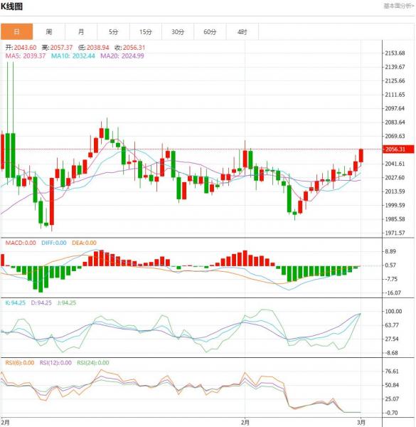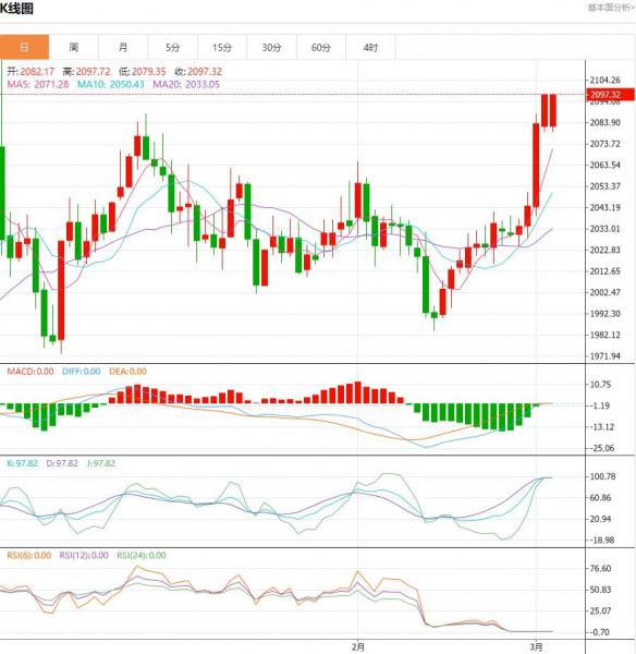 周一(3月4日),油价涨0.25%,从油价表现来看后市预期较为乐观,油价重心也缓慢抬升,上周五夜盘油价大涨是过去一段时间窄幅区间蓄势之后市场博弈的自然选择。 黄金盘面分析: 黄金上周正如预期向上大幅拉涨,最高2088周图收大阳柱。从图形来看,后市黄金继续上行的概率较大些,目标仍为2110附