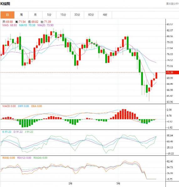 今日晚间周四,原油报71.41/71.45。黄金报1985.88/1986.21。星期三(三月二十二日)美原油周三小幅走低。AI数据显示上个星期美国原油库存意外增加,暗示燃料需求或走弱。此外,油价在此前震荡区间的底部面临阻力。 原油盘面分析 油价在近日逐渐回升后,今日小幅走低。虽然没有人可以自信地说银行