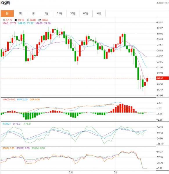 3月20日(周一)亚市盘初,美油交投于67.04美元/桶附近;油价上周五下跌近3%,银行业的担忧导致油价创下两年多来最大周跌幅。美股走低也拖累油价,市场对经济衰退的担忧的困扰增加。 今日原油价格技术分析: 油价前一个交易日继续下跌,没能收复70关口,基本确认了向下突破,后市偏向空头。短线的