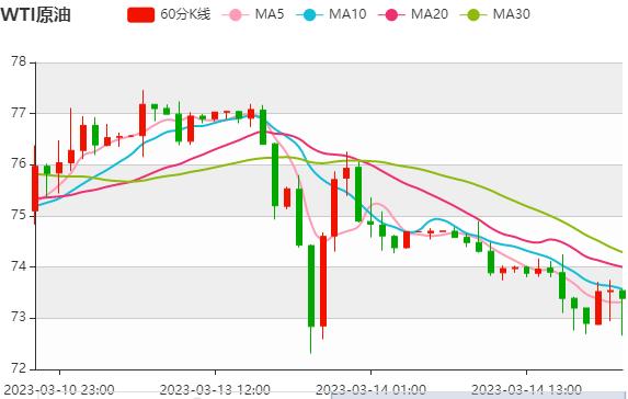 今日晚间周二,原油报73.75/73.78。黄金报1899.72/1900.06。周二(3月14日)亚洲时段,美原油震荡走弱,延续了前一天的跌势,硅谷银行倒闭事件让股票市场感到震惊,并引发对新的金融危机的担忧,欧美股市全线大跌,对油价拖累明显。 原油盘面分析 油价继续震荡,同时保持在自12月初以来的广泛交易