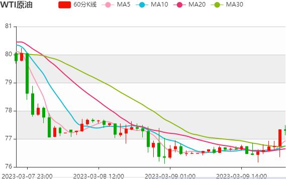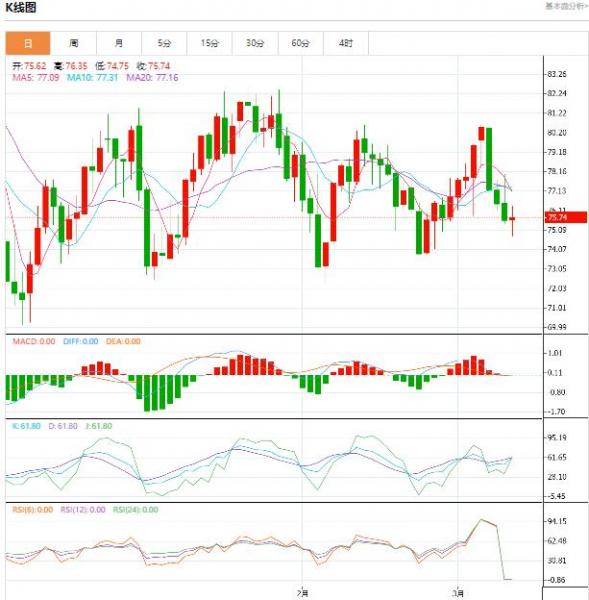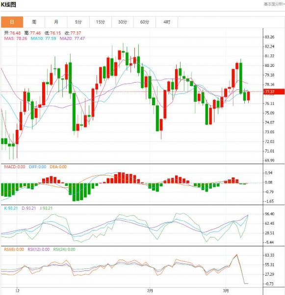今日晚间周四,原油报77.88/77.92。黄金报1830.58/1830.91。星期四(三月九日)亚洲时段,美原油窄幅震荡,尽管根据IA公布的数据显示原油库存下降,不过,汽油库存降幅不及预期。由于担心俄石油产量可能超出预期,著名投资银行下调了油价预测,这也打击了多头的士气。 原油盘面分析 WTI原油价格