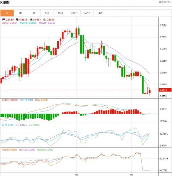 美联储主席鲍威尔在周三出席众议院金融委员会作证时,软化了早前一日的鹰派立场,称未确定3月加息幅度,还得依赖未来数据。当天美国公布的就业数据依旧强劲,表明美元指数尽管在早前一日大涨后陷入窄幅整理,但上行基础仍稳固。商品货币澳元和纽元跟随市场情绪有所企稳。 货币对:澳元/美元 行情