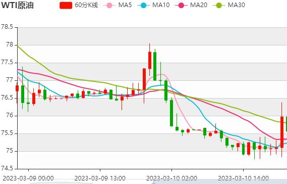 今日晚间周五,原油报75.90/75.94。黄金报1851.15/1851.51。星期五(三月十日),美国原油继续下跌,由于交易商对美联储频繁且更剧烈的加息持警惕态度,加剧了对全球经济衰退的担忧,全球股市普遍走弱,拖累了油价。 原油盘面分析 油价已经收复了早些时候的跌幅,但随着我们接近交易周结束,当天