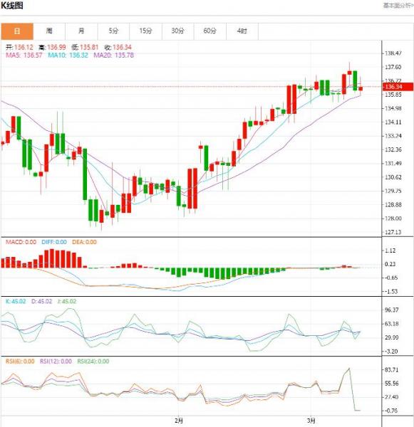 周五盘中,截止目前,美元/日元货币对136.11/136.10,下跌至0.01,跌幅0.01%。日元过于疲软是不合理的。 黑田东彦出席最后一次议息会议,日本央行依然维持超宽松货币政策不变,日元小幅贬值。但德国商业银行经济学家认为,目前日元正在走弱,但日元过于疲软是不合理的,原因有二,其一是维持宽松政策本