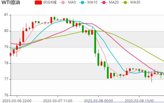 今日晚间周三,原油报77.19/77.23。黄金报1814.59/1814.89。星期三(三月八日),亚洲时段,美国原油交易小幅走高,虽然美国AI原油库存出乎意料地下降,给油价提供了支撑,不过,美联储(fd)主席的鹰派言论继续推动美元指数飙升,而对衰退的担忧加剧,令油价承压。 原油盘面分析 WTI原油价格周二