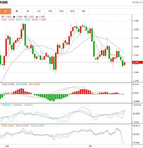 周一盘中,截止目前,英镑/美元货币对1.1982/1.1981,上升至0.0045,增幅:0.42%。英镑/美元跌破关键支撑点位,英镑跌破100-200日移动均线的汇合点,均线的看涨交叉,到目前为止影响不大。如果收于云区1.2049以下,将保持压力。初步支撑在2月17日低点1.1915,新的损失确认了周线上的空头倾向。云区下滑并增厚,目前1.