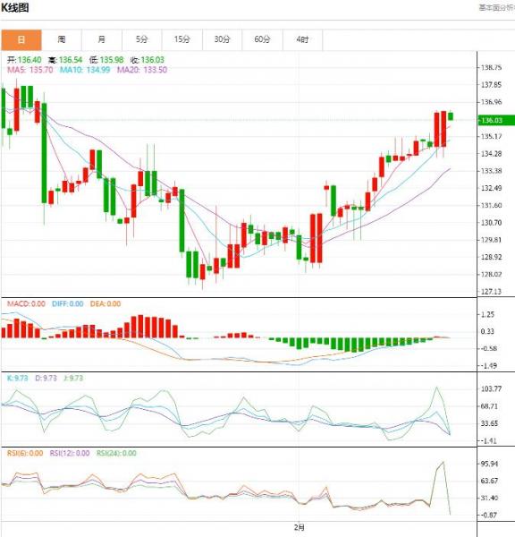 周一盘中,截止目前,美元/日元货币对136.05/136.04,下跌至0.44,跌幅0.32%。美元/日元看来在蓄势上涨,重新测试136.66。 美元/日元突破云区顶部后可能飙升,美元/日元突破了位于131.19-134.85的云区顶部,测试关键回档位136.66的过程中将有更大的上涨空间。136.66是10月至1月从151.94至127.22跌势的38