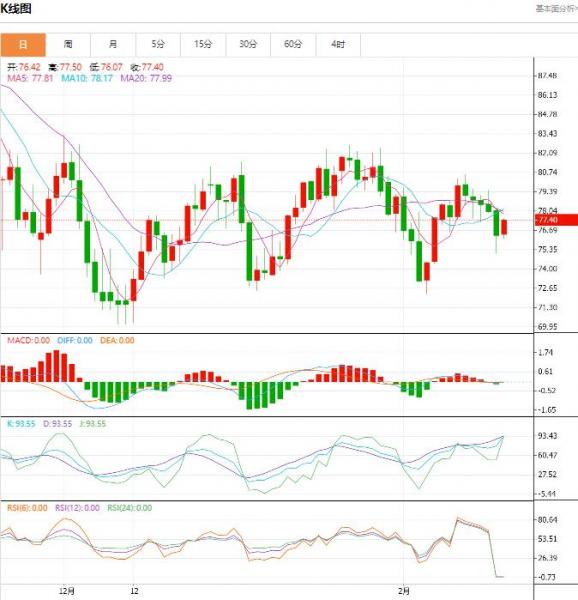 今日晚间周一,原油报75.76/75.80。黄金报1845.91/1846.25。上星期五(2月17日)油价上跌超百分之二,周线也大下跌,交易商忧虑,美国进一步加息将拖累未来需求,他们对越来越多的原油,以及成品油供应充足的迹象感到紧张。 原油盘面分析 油价在上周从近期高位下滑后略有反弹。今天围绕中国的乐观