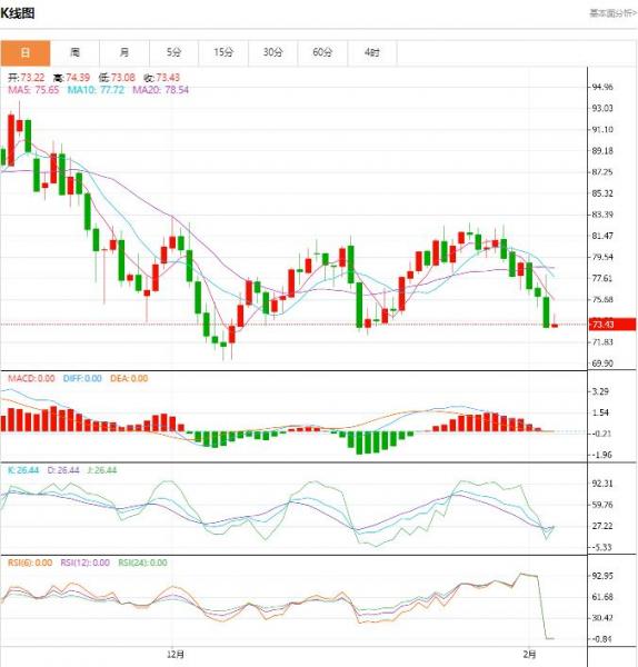 2月6日(周一)亚市盘初,美油交投于73.50美元/桶附近,油价上周五大跌3.7%,触及逾三周最低,此前强劲的美国就业数据引发了对利率上升的担忧,且投资者寻求有关欧盟即将对俄罗斯成品油实施禁运的更多信息。 今日原油价格技术分析: 油价在布林线附近受阻后继续下跌,现在已跌至布林线下轨附近,