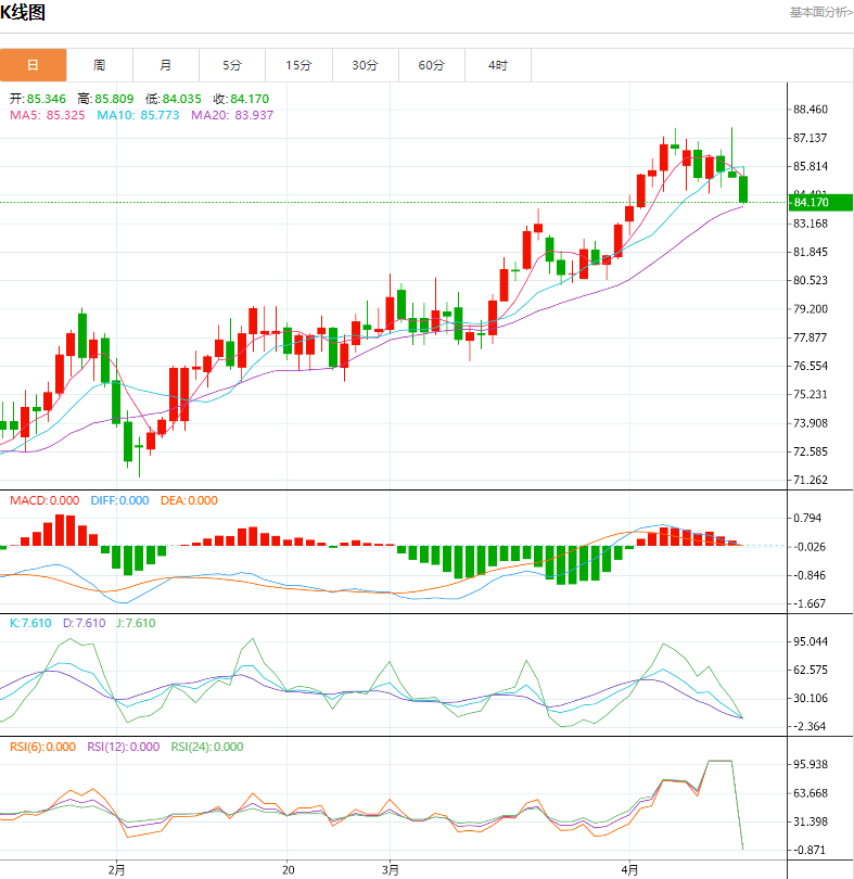 油价从周五夜盘高位回落最大超3美元。不过夜盘油价还是从日内低点反弹明显,中东地缘因素虽有缓解,但仍有反复,虽然以色列总理称不对伊朗采取报复行动,但以军总参谋长称伊朗对以色列的袭击“将得到回应”。 今日原油价格技术分析: 昨天美原油整体上先跌后涨,日线收于85.5,伊朗周末对以色列的