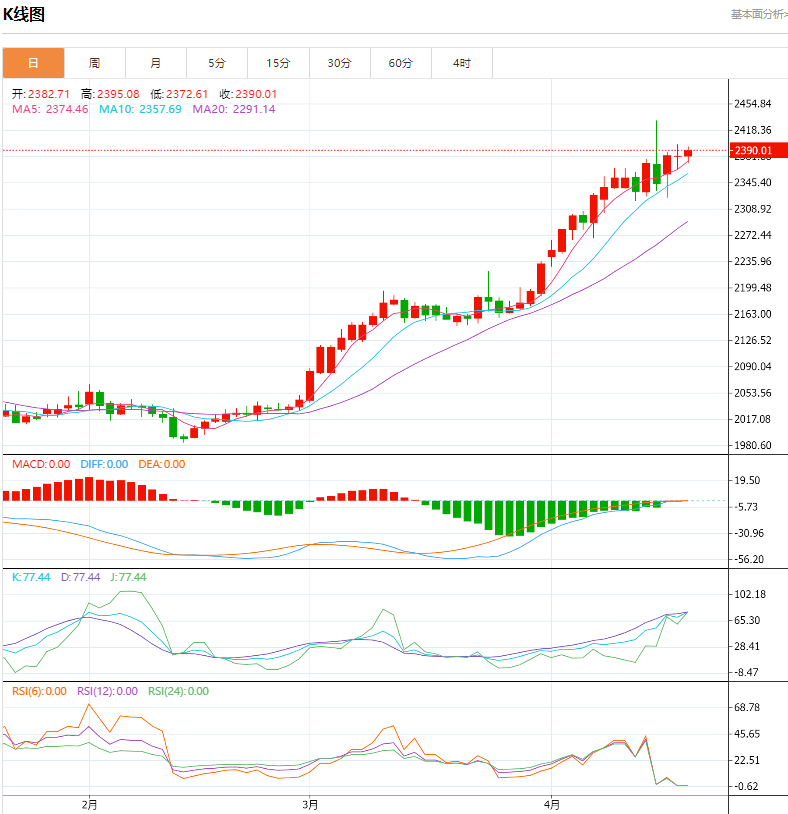 尽管美元和美国公债收益率在强于预期的美国3月零售销售数据公布后上涨,但受助于中东紧张局势推动避险需求,以及投资者对于黄金追逐的热情不减,黄金反弹仍顽强停留在历史高价位区域。 今日黄金价格技术分析: 从技术层面分析,隔夜反弹已经确认了2325-2324美元这一支撑区域的有效性,因此,该区域现已成