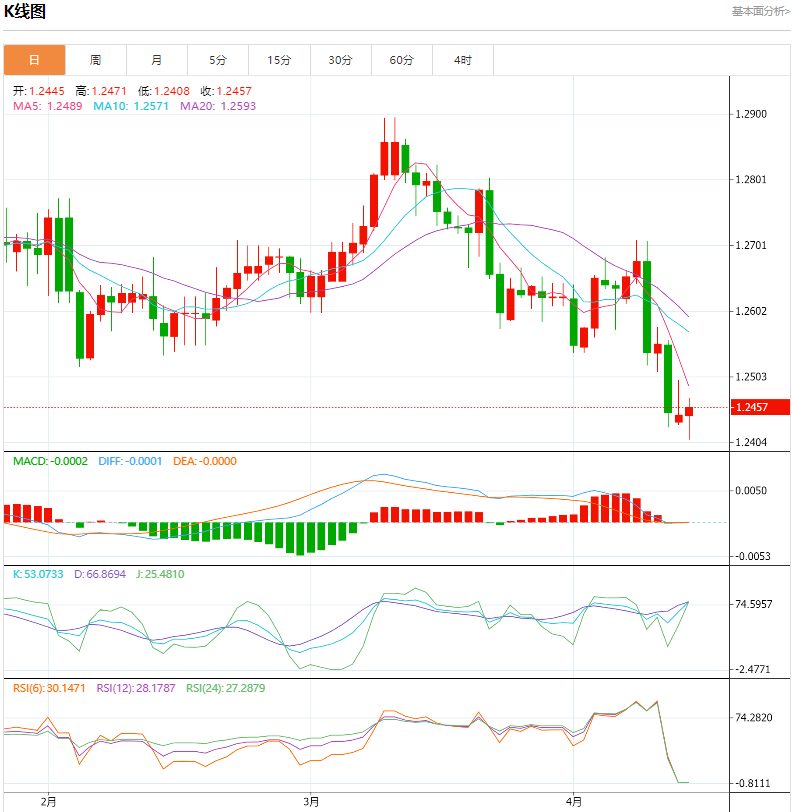 周二美市盘中,英镑兑美元上升至0.0011,增幅0.08%。根据英国国家统计局的最新数据,英国2月份失业率达到4.2%,超过了市场预期的4.0%和上个月的3.9%。包括奖金在内的平均收入增速保持在5.6%不变,而不包括奖金的收入略有下降0.1%至6.0%。 货币对:英镑/美元 行情分析:汇价高见1.2471,低见1.2408。上一